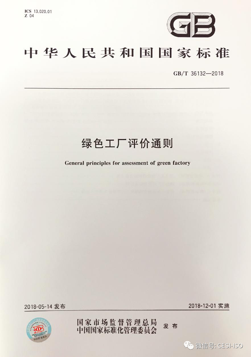 2018年5月14日,我国绿色工厂领域首项国家标准《绿色工厂评价通则》正式发布,标准号GB/T 36132-2018。该标准由中华人民共和国工业和信息化部提出,中国电子技术标准化研究院联合电子、钢铁、石化、建材、机械、汽车等重点行业研究机构、协会、企业共同起草。